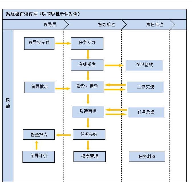 系統通過標準化督辦業務流程,有效協同公司領導、督辦人員、主辦部門、協辦部門、具體責任人等多方人員的線上工作。具體工作流程如