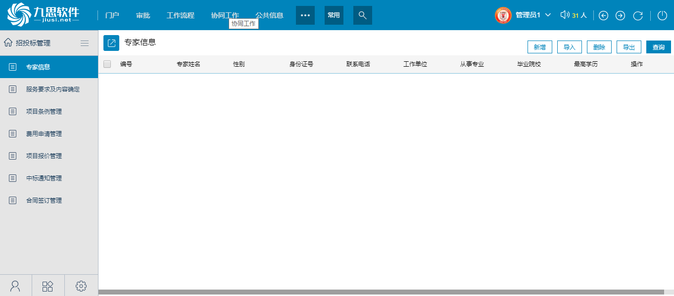 九思招投標協同OA系統可實現客戶資源集中管理,針對招標過程中所需專家信息進行集中管理及對招標項目費用、收益等情況的數據管理、分析、匯總,幫助招投標機構實現招投標企業對核心業務工作的標準化、信息化。