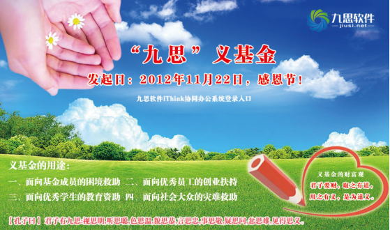 九思人相信,最好的公益是為社會(huì)持續(xù)創(chuàng)造價(jià)值!多年來(lái),我們?cè)谑聵I(yè)上努力進(jìn)取的同時(shí),在內(nèi)部嘗試推行義基金;在外部大災(zāi)大難面前,我們也在積極嘗試與希望工程、發(fā)改委下轄基金會(huì)、騰訊公益平臺(tái)、中國(guó)海洋大學(xué)教育基金會(huì)等合作,力爭(zhēng)能為社會(huì)盡一份綿薄之力。