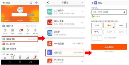 消費者可以登錄淘寶網或手機淘寶,在“我的淘寶”——“我的卡券包”——“我的流量錢包”中查詢流量余額。根據不同運營商設置的30M-1000M不同的檔位,可將流量充入手機號碼中,提取成功后當月生效,全國不分地域均可使用。