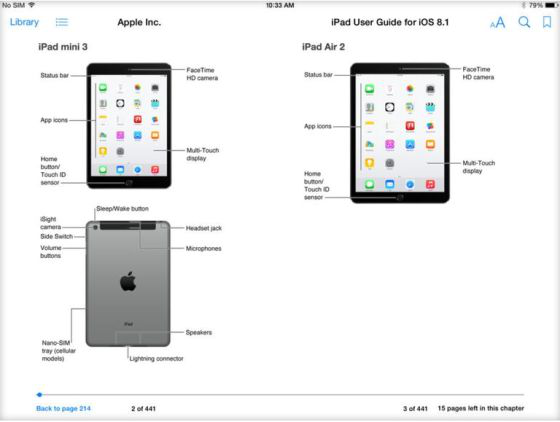 這些截圖是在蘋果公司為iBooks發布的iOS 8操作系統官方用戶指導中外泄的,展示了上述兩種新增Touch ID指紋掃描功能的iPad新機型。截圖還表明,iPad Air 2將配備“Burst Mode”快速連拍功能。除了這些新功能以外,新款iPad與以往機型看起來十分相似。