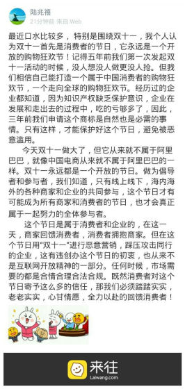 新浪科技訊 11月5日下午消息,阿里巴巴集團CEO陸兆禧今天在其來往動態中發聲,稱雙十一永遠都是一個開放的節日,屬于一起努力的全體參與者。作為雙十一發起者和倡導者,阿里注冊雙十一商標是自然也是必需的事情,主要是為了“保護好這個節日,避免被惡意濫用。”