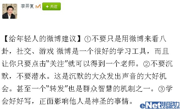 如今,微博已經成為大眾發出自己聲音的一個最有利的平臺,通過微博我們可以了解社會上發生的千奇百態。對于此,李開復特意給出了三點建議給廣大年輕人,希望所有人都可以通過微博學習積極的東西,并用微博發布積極的內容來影響他人,而不要只沉迷于八卦,游戲等內容。