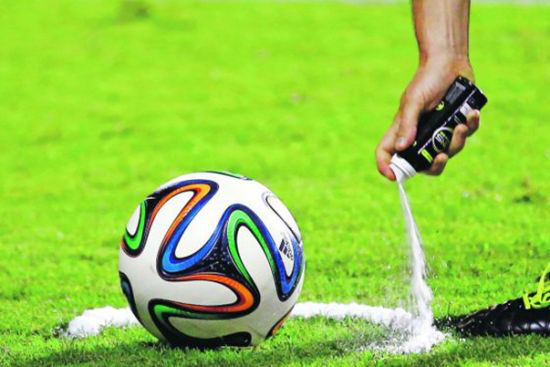此外,這種噴霧還能被用于限定定位球的擺放位置。進攻球員在獲得定位球機會后,喜歡趁裁判不注意,把皮球往前扔幾米、“拱一拱”,以拉近與球門的距離。如今裁判只需用噴霧畫個圈子,球員就只能老老實實原地罰球了。