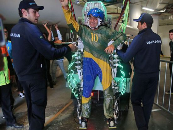 6月13日的巴西世界杯開幕式上,一名巴西癱瘓青年身穿“腦控外骨骼”,踢出了本屆世界杯的第一腳球。這種外骨骼能夠讓癱瘓患者重獲行走能力。