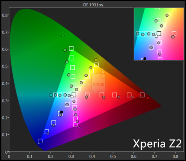 Xperia Z2的屏幕色溫為6900K,表現最好,而iPhone 5s和HTC One (M8)均在7150K左右,LG G3的成績約為7100K,三星S5的屏幕在這個環節表現最差,標準模式下,屏幕色溫為8100K(另有測試成績稱為 7900K),當然,用戶也可以調節成其他模式來降低色溫到比較正常的6700K左右。