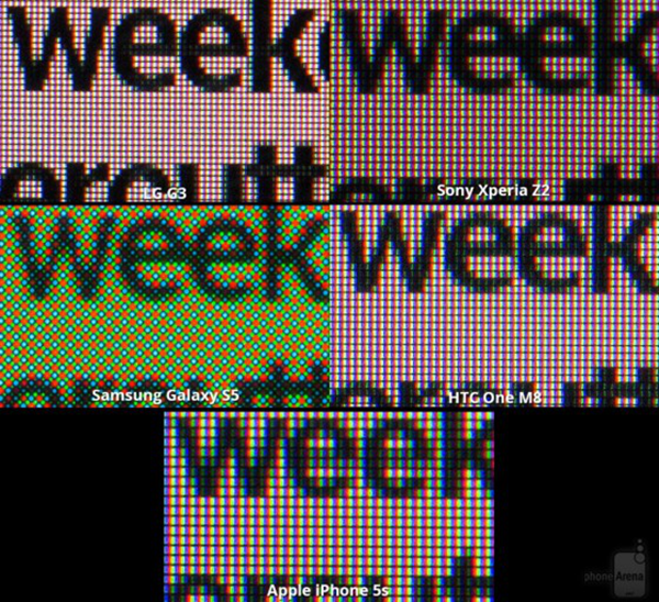 借助更為敏銳的鏡頭,我們能夠看到這些精細屏幕下更多的細節,這里,LG G3和iPhone 5s的差距就十分明顯了,好在我們的眼睛還未進化到如此地步。