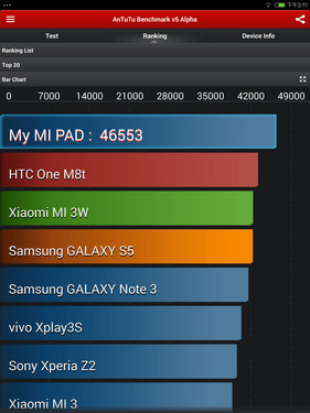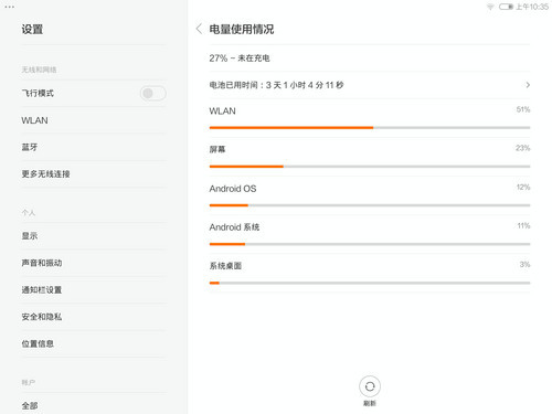 小米平板采用的視網膜屏和Tegra K1芯片(額定功率5W)都是耗電大戶,盡管配備6700毫安時大容量電池,機身厚度也因此增至8.5毫米,續航能力卻不是很強。筆者時間測試,在滿電情 況下待機3天后剩余27%,官方宣稱的400小時待機純屬娛樂。超負荷運行不到4個小時電量告罄。