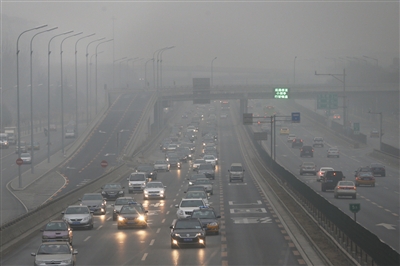 昨日,四惠橋東,車輛開(kāi)著燈在霧霾中前行。北京在內(nèi)的全國(guó)多個(gè)城市空氣污染指數(shù)達(dá)到重污染。新京報(bào)記者 尹亞飛 攝