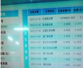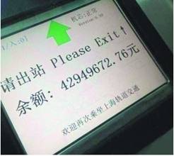 2012年11月10日,王小姐在軌交9號線打浦橋站進站前,到交通卡自動充值機上進行交通卡充值,卻發現自己最近的一次交易金額竟然是-18789826.56元。她頓覺奇怪,自己上次使用公交卡是有欠費,但也不至于那么大金額吧。她到地鐵站服務中心詢問工作人員獲知,可能是卡內芯片有誤。該交通卡經過人工操作恢復正常并充值成功。