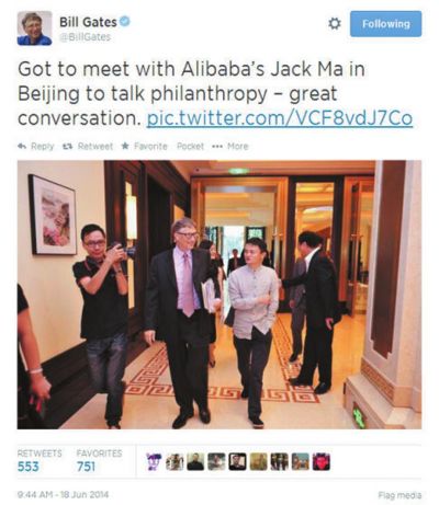 昨天上午,比爾·蓋茨在推特上發了一條消息:“在北京與阿里巴巴JakeMa(注:馬云的英文名)談論慈善事業——一次很棒的會談。”還配發了二人邊走邊談的照片。昨天,記者就此詢問阿里方面,對方表示,此次飯局是馬云做公益慈善的行動之一,是以他個人名義舉辦的,所以阿里方面無法透露二人此次商談的細節。記者從其他渠道獲悉,此次馬云組織的與比爾·蓋茨的飯局,還邀請了任志強、牛根生、招商銀行前任行長馬蔚華、銀泰百貨董事長沈國軍、影視明星趙薇的丈夫黃有龍等人作陪。