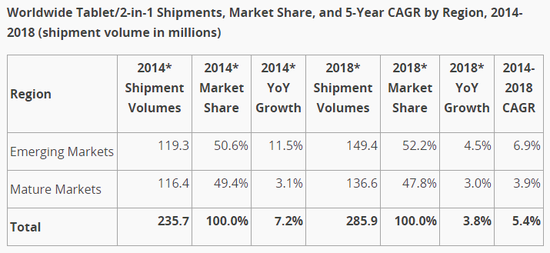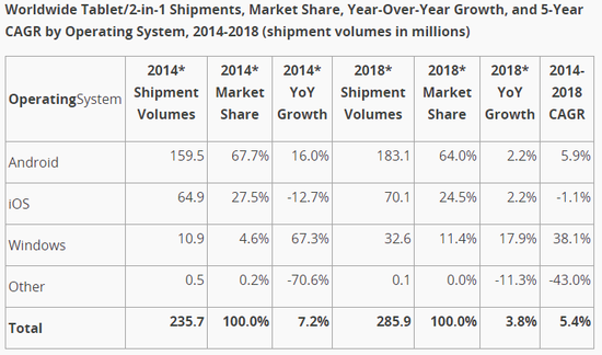 谷歌Android依然是市場(chǎng)的絕對(duì)統(tǒng)治者?;谠撓到y(tǒng)的平板電腦出貨量今年占到市場(chǎng)總額的68%,接近1.60億臺(tái)。而蘋果iOS則緊接其后,今年出貨量預(yù)計(jì)接近6500萬(wàn)臺(tái),占市場(chǎng)總額的27.5%。