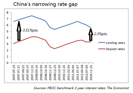第二,這是中國邁向利率自由化的重要一步。以前銀行的存款利率可以比基準(zhǔn)水平高10%,現(xiàn)在可以高20%。銀行間對儲戶的爭奪應(yīng)該能使銀行提供盡可能高的利率。以前一年期存款利率實際為3.3%(比這次降息前的3%高10%)。降息后應(yīng)該會停留在3.3%(比新的基準(zhǔn)利率2.75%高20%)。同時,一年期貸款利率降至5.6%。理論上,貸款利率已經(jīng)實現(xiàn)自由化了,并沒有設(shè)上限,不過實際上銀行稱他們貸款定價依然比基準(zhǔn)低。