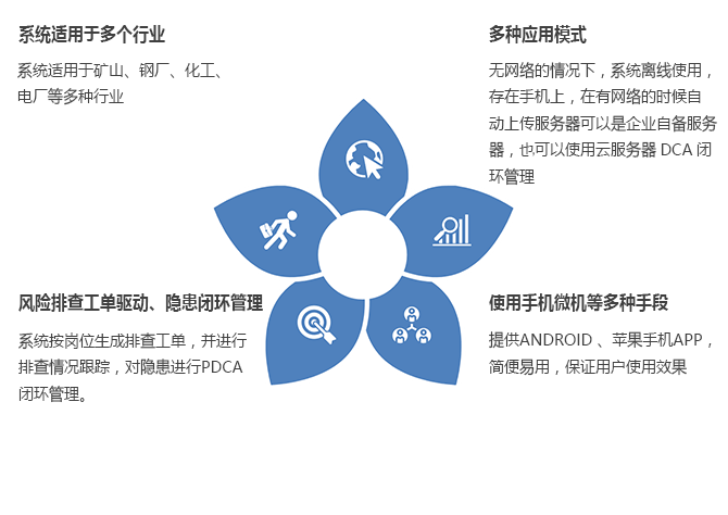 提供風(fēng)險(xiǎn)源評(píng)估管控標(biāo)準(zhǔn)庫、安全檢查及隱患處理標(biāo)準(zhǔn)庫,不安全行為處理標(biāo)準(zhǔn)庫,同時(shí)與手機(jī)等移動(dòng)端配合使用,降低了對(duì)經(jīng)驗(yàn)依賴,避免漏查、誤判。通過系統(tǒng)對(duì)隱患進(jìn)行下達(dá)、整改、反饋,復(fù)查、銷號(hào),一鍵推送信息管理,實(shí)現(xiàn)PDCA閉環(huán)管理,避免人工送報(bào),快速、高效,節(jié)省人力、物力。
