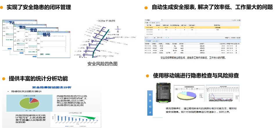 利用移動(dòng)端和微機(jī)一體化管控,關(guān)口前移,隱患上報(bào)更及時(shí)準(zhǔn)確。數(shù)據(jù)一次錄入,多處調(diào)用,自動(dòng)生成安全報(bào)表,降低了安全報(bào)表制作統(tǒng)計(jì)的工作量。利用歷史數(shù)據(jù),橫向、縱向統(tǒng)計(jì)隱患信息,多種圖表展示,為安全決策提供依據(jù)。系統(tǒng)提供多種預(yù)警數(shù)學(xué)模型、預(yù)警渠道,真正實(shí)現(xiàn)智能預(yù)警。